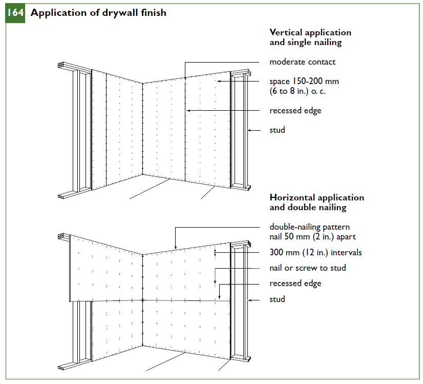 Although 9.5 mm (3⁄8 in.) thick gypsum board may be used on walls with support spacings up to 400 mm (16 in.) on centre when the boards are oriented perpendicular to the framing, 12.7 mm (1⁄2 in.) gypsum board is more commonly used because of its extra stiffness and strength. Where supports are spaced at 600 mm (24 in.) on centre, the minimum thickness should be 12.7 mm (1⁄2 in.). When gypsum board supports insulation, it must be at least 12.7 mm (1⁄2 in.) thick. Some ceiling gypsum board is specially designed to resist sagging when water-based textured finishes are applied to a ceiling. A 12.7 mm (1⁄2 in.) panel can be installed perpendicular to supports at spacings up to 600 mm (24 in.).